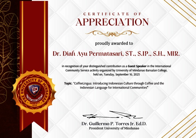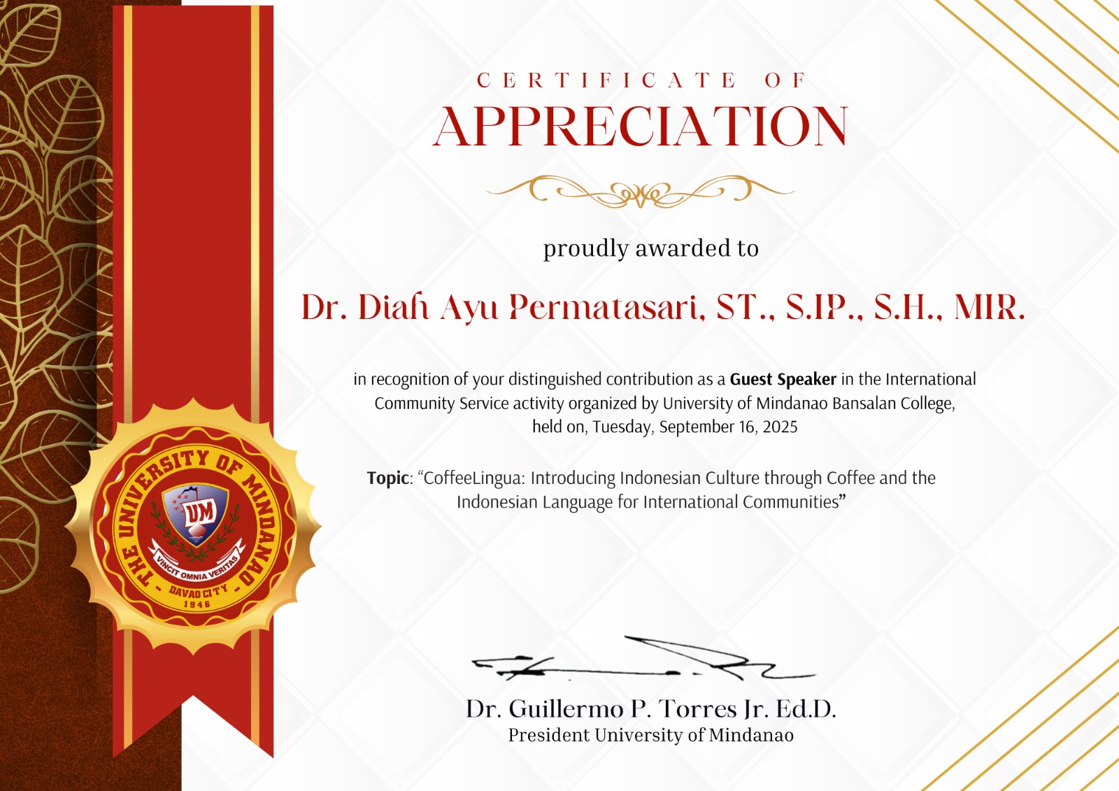 University of Mindanao, President Sertifikat Guest speaker. University Of Mindanao.