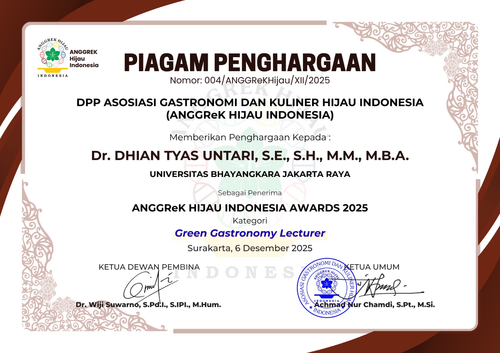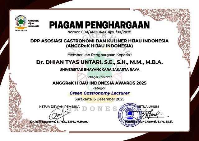 Untari, Dhian Tyas Piagam Penghargaan Green Gastronony Lecture. Mandiri. (Unpublished)